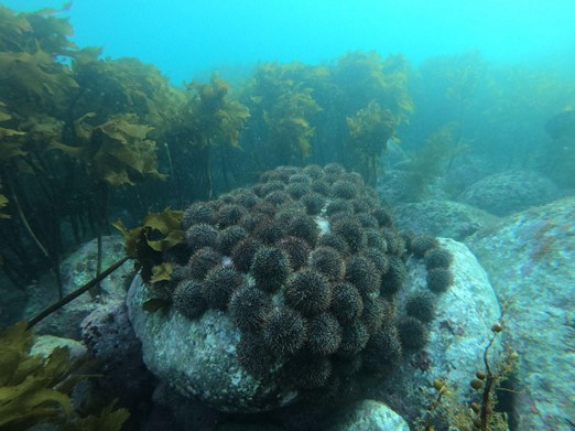 Dense kina clusters amongst Ecklonia radiata kelp forests on boulders at 10m depth. Photo: Nick Shears, University of Auckland.